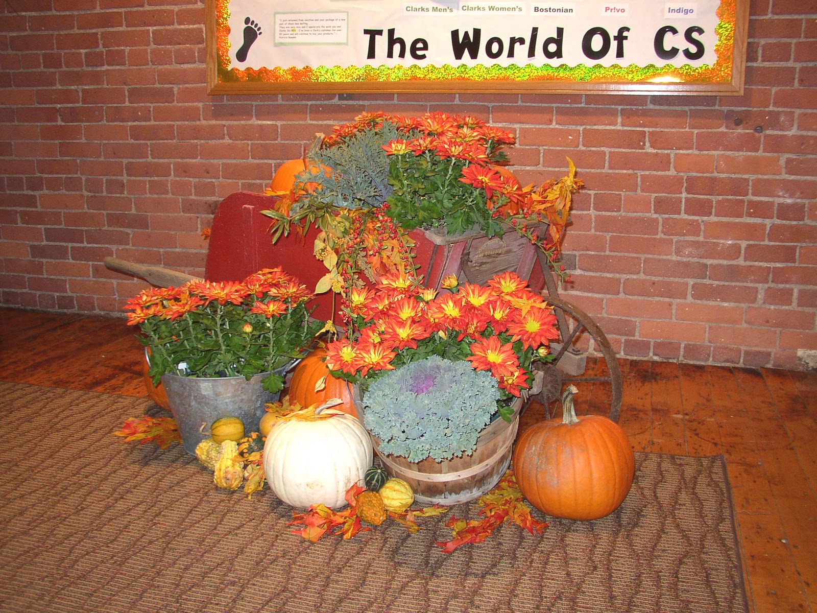 - Plantscape Designs Inc. uses live colorful mums, cornstalks, kale, haystacks logs as well as various sizes of pumpkins in our Billerica, MA office fall scenes.